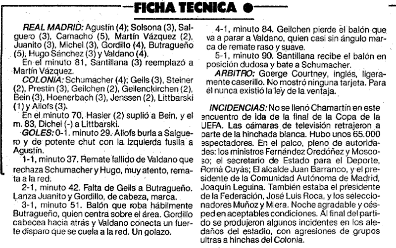 CALIFICACIONES: REA,L MADRID: Agustín’(3); Sanchía (-), Maceda (3), Camacho (5);Michel (3), Gallego. (4), Chendo (4), Gordillo (4); Butragueño (5), Hugo Sánchéz (3) y Santillana (4). En él minuto 14 Salgiiero (3) re emplazó a Sanchís lesionado, y én elminuto 108, Juanito a Gordillo. INTER: Zenga (4); Bergomi (3),Collovati (2), Baresi (2), Mandorlini (2’); Ferri (2), Brady (3), Fanna (4),Tardelli (3); Altobelli (3) y Rummenig ge (1). - En el minuto 56, Marini (3) por Altobelli, y el’ el 83, Bernezzani por Rummenigge.