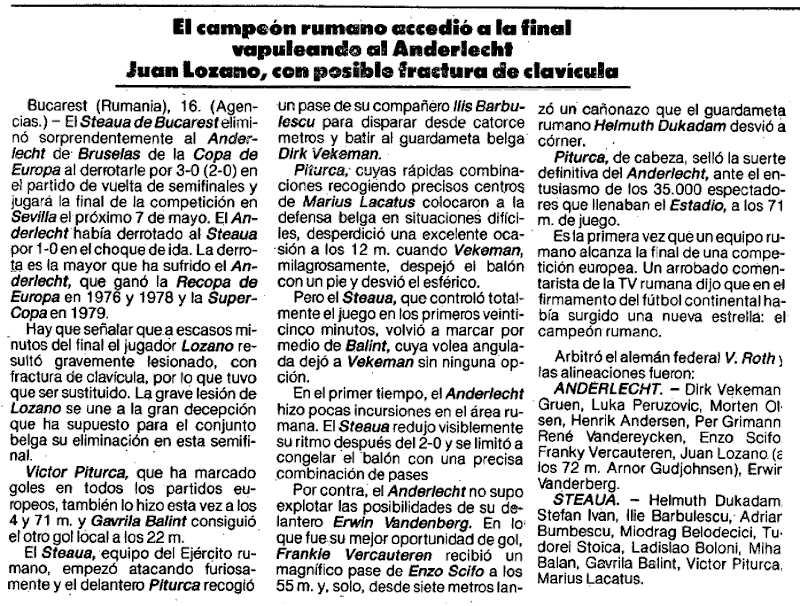 El Steaua de Bucarest, rumano, el Dinamo de Kiev, soviético, y el Colonia, alemán occidental, serán los rivales de los equípos españoles en las tres finales europeas.El Steaua, que se enfrentará al Barcelona el 7 de mayo, en el campo Ramón Sánchez Pizjuán de Sevilla, dio la única sorpresa al golear con autoridad al Anderlecht de Bruselas, belga, por 3-0, tras haber perdido, por 1-0, en la ida. El Dinamo de Kiev, rival del Atlético en la Recopa el 2 de mayo, en Lyon (Francia), empató a un gol en Praga, frente al Dukla, checoslovaco, trashaber ganado, por 3-0, en el primer encuentro. En cuanto al Colonia, que jugará a doble partido con el Real Madrid, el 30 de este mes en el Bernabéu y el 6 o el 8 de mayo en la RFA, igualó, 3-3, en el terreno del Waregem, belga, tras su amplio triunfo ya en el primer partido, por 4-0.