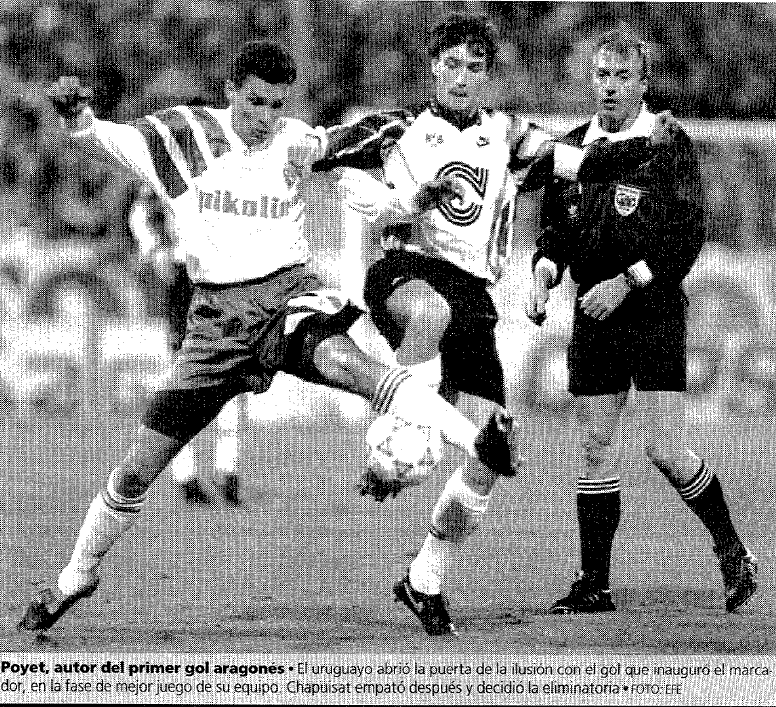 El Real Zaragoza habia intentado la misión de marcar dos goles y no recibir ninguno para seguir adelante. El equipo de Victor Fernández , mellado fisica- mente varios de sus hombres , jugó una buena primera mitad , que concluyó con 1-0 gracias al gol de Gustavo Lopez .El día festivo propició que el estadio de la Romareda registrara una fenomenal entrada, con ruidosa presencia de un grupo de seguidores alemanes, y el ambiente fuera mejor para disfrutar de un buen rato de futbol. Los de casa los brindaron de salida , cuando las fuerzas está, enteras , aprovechando que el Borussia salió a verlas venir.Los alemanes confiaban en Chapuisat y el enl ex-madridista Polvsen para resolver si su suerte se torcía. Chapuisat y Povsen forman una pareja de ataque de muchisimos quilates que ,de entrada , tuvo que dedicarse a achicar mas que a construir .Pero cuando debieron decidir , lo hicieron. Una Falta botada por Brehme , que se perdió cerca del palo izqiuierdo de la meta defendida por Klos , fué el primer aviso de un Zaragoza aguerrido , dominador y decidido a dar la gran batalla. Higuera , el propio Poyet , e incluso Seba , disfrutaron antes y después del gol del uruguayode oportunidades mas o menos claras para abrir el tanteador , pero les faltó hacierto para culminar y suerte en alguna acción , como fué el remate de gay que tropezó en un defensa , describió una parábola y obligó al meta a estirarse para meter el puño en ultima instancia y enviar el balón a corner. Esa opción duró quince minutos , los que necesitó el conjunto aleman en equilibrar el marcador y desequilibrar las opciones Zaragocistas , al que el empate le pesó como una losa.Físicamente mas entero , el Borussia congeló el partido y la caldera zaragozana. El ultimo golpe de genio de los aragoneses permitió encerrar al adversario en la rectaa final del partido , a base de corazón .Un penalty que inventó Pardeza y transformó el alemán Brehme valió para ganar el partido y despedirse de europa con la cabeza alta .