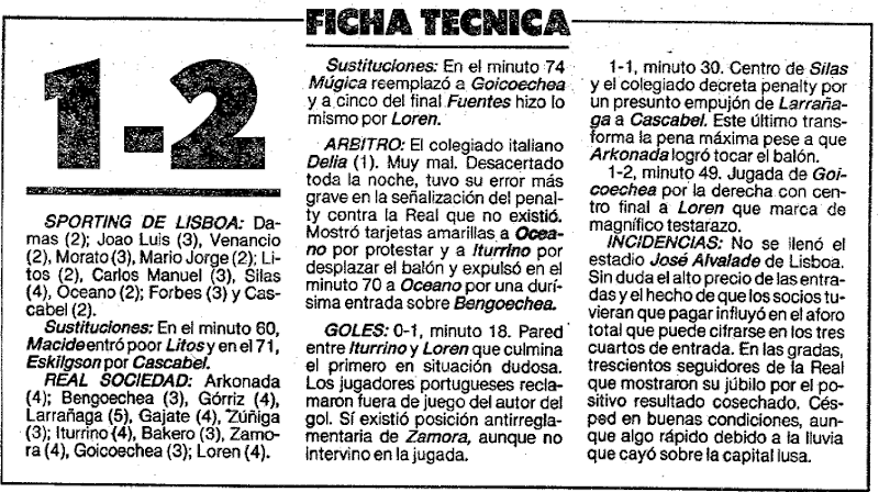 Así lo contó 'El Correo': "El Athletic, eliminado de la Copa de la UEFA. El Athletic fue ayer eliminado de la Copa de la UEFA, tras perder por tres goles a cero ante el Spórting de Lisboa. Fernandes, de penalty, en el primer tiempo; Meade y Sousa, en la segunda mitad, fueron los goleadores del encuentro. Los portugueses se mostraron muy superiores ante un Athletic muy encogido que casi siempre se vio superado por su rival. Julio Salinas, a los 53 minutos, tuvo la oportunidad de igualar el encuentro al presentarse solo ante Damas, pero su disparo no encontró las mallas portuguesas. La aventura europea de los hombres de Clemente ha llegado a su punto final."